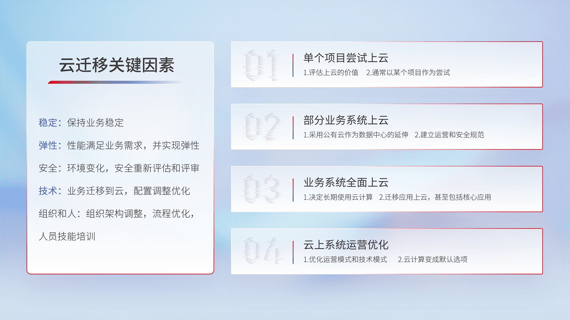 结合实际业务,,,从规划设计、、、云平台选型、、云原生改造、、数据迁移、、、、集成交付,,,迁移全过程为客户识别最佳上云路径,,做好风险识别管理,,设计网络架构、、身份权限、、、安全审计合规、、、、操作审计、、、日志审计、、监控告警策略、、、多站点容灾设计等,,,,对云上基础设施进行整体规划,,,,提升IT治理水平,,以满足弹性、、、高可用、、、、高性能的需求。。。。